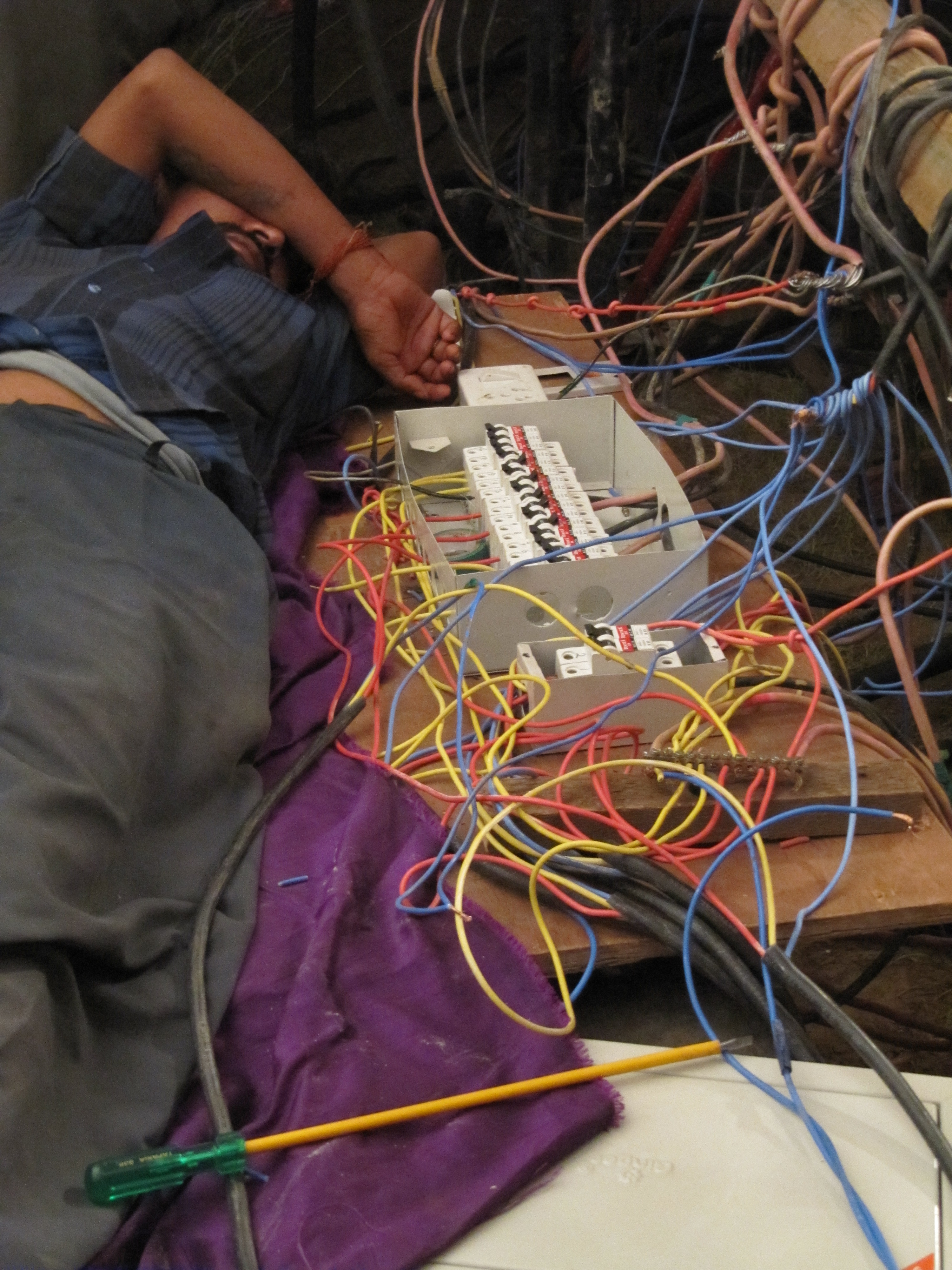 We were just getting to sleep in our hotel rooms when the phone rang at 6am. Someone had put a nail through an electricity cable! We arrived on site to find two projectors blown and unuseable, we had to find a way to fill the gaps…and quick. A call went out and two underpowered projectors arrived by about lunchtime and we did our best, not perfect but holes plugged.