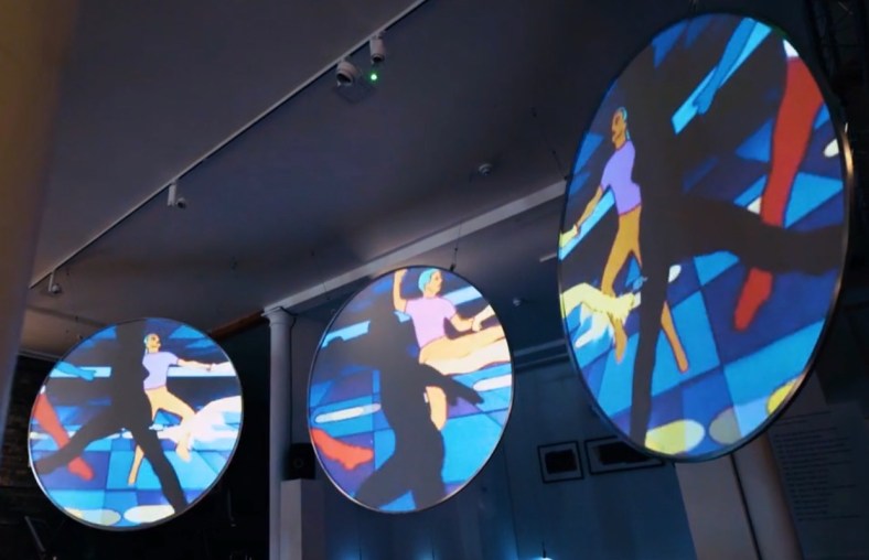 I was particularly pleased to achieve the three circular screen projections using only two media players and involving no projection mapping software, just a circular mask on the content.