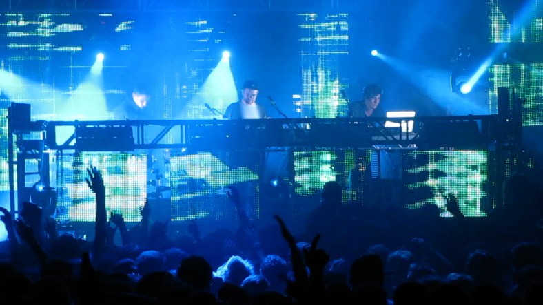 I designed and fabricated the triangular screens using a mixture of rear and front projection materials. I worked with the artists to create content for the triangular screens and use the design successfully.